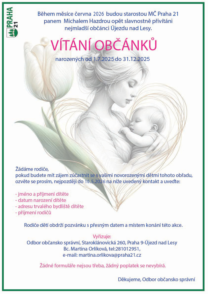 Během měsíce června 2026 budou starostou MČ Praha 21 panem Michalem Hazdrou opět slavnostně přivítáni nejmladší občánci Újezdu nad...Omezení provozu – občanské průkazy, cestovní doklady a evidence obyvatel