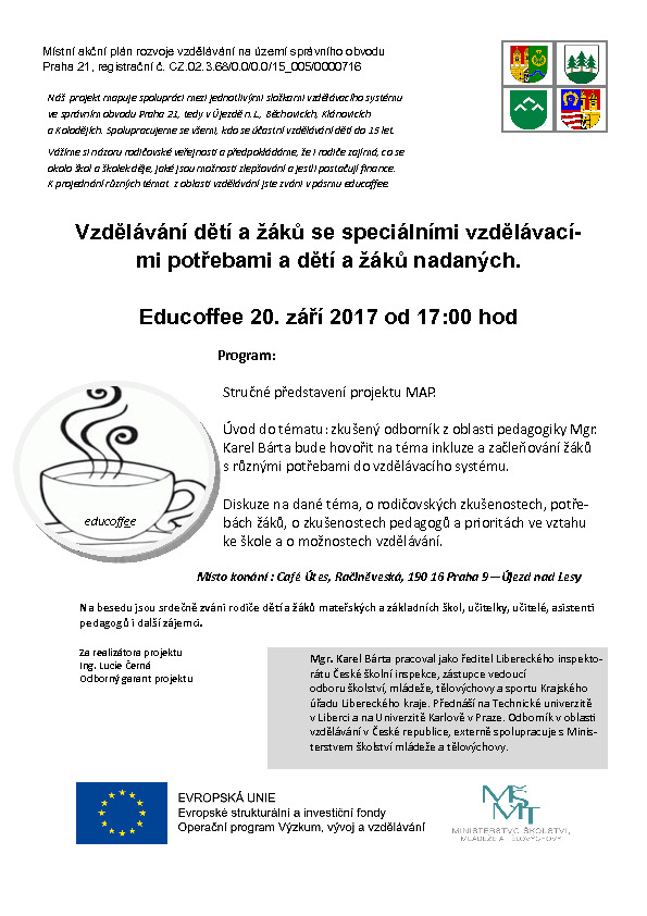 Dne 20. 9. 2017  od 17 hodin v Café Útes, Račiněveská, 190 16 Praha 9 se uskuteční v rámci probíhajícího projektu MAP Praha 21 beseda se zkušeným odborníkem z oblasti pedagogiky Mgr. Karlem Bártou, který bude hovořit na téma inkluze a začleňování žáků s různými potřebami do vzdělávacího systému.