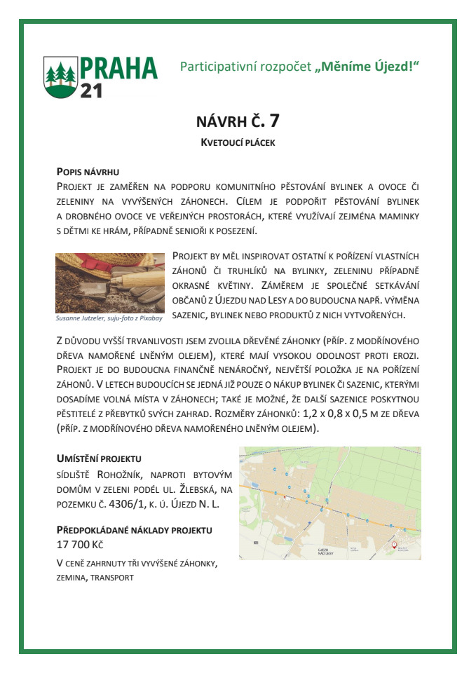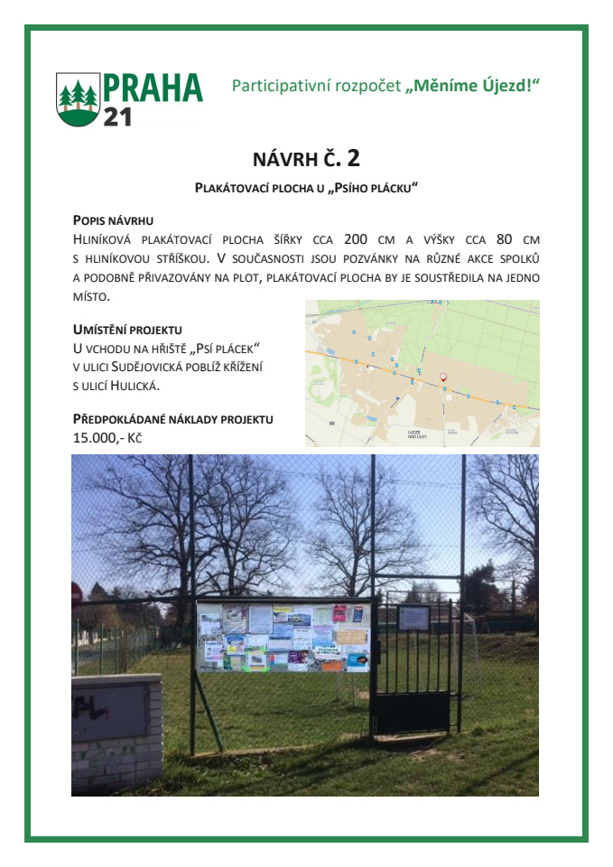 Pokud máte nápady, co by se dalo vylepšit na pozemcích naší městské části nebo hl. m. Prahy v Újezdě nad Lesy, využijte této příležitosti. I obyčejná lavička, veřejná pumpa či mlatová cesta nám pomůže k lepšímu Újezdu nad Lesy! Dejme hlavy dohromady. Startujeme na jaře 2020!
