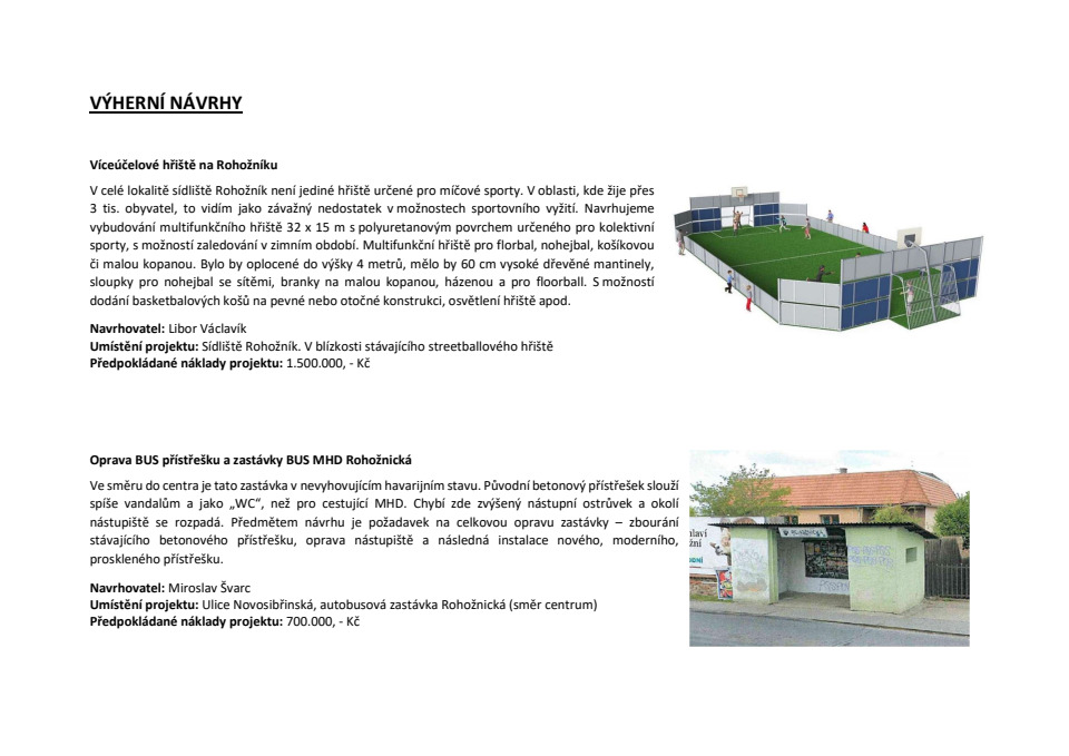 Absolutním vítězem mezi návrhy se stal projekt „Víceúčelového hřiště na Rohožníku“. V těsném závěsu se umístil návrh „Oprava BUS přístřešku a zastávky BUS MHD Rohožnická“. Na třetím místě skončil návrh „Lanová věž na Rohožníku“.