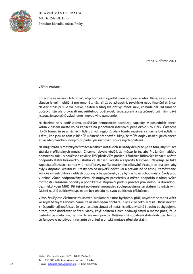 AktualitaDopis PražanůmNaposledy upraveno: 3. březen 2021Dopis Pražanům.pdfPoslední změna: 03. 3. 2021, 15:50:07, velikost: 188.45 KB Stáhnout Číst Náhled Osoba odpovědná za aktuálnost informací: StavPublished