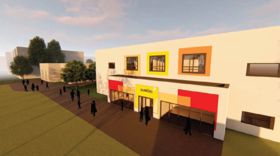 Architektonicky a barevně v souladu se sousední budovou ZŠ