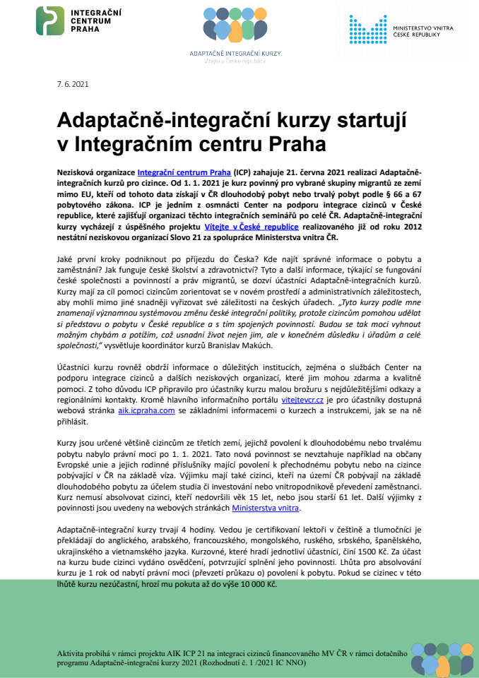 Nezisková organizace Integrační centrum Praha (ICP) zahajuje 21. června 2021 realizaci Adaptačně - integračních kurzů pro cizince.