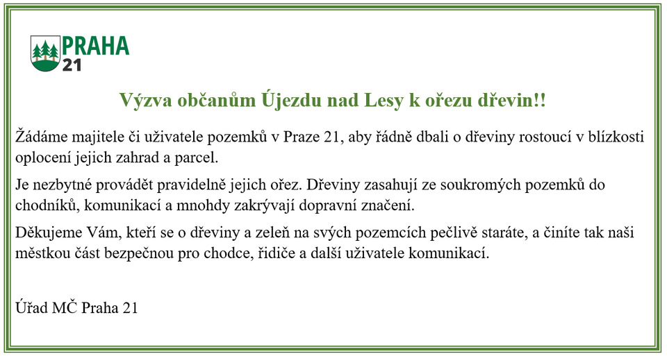 Výzva občanům Újezdu nad Lesy k ořezu dřevin