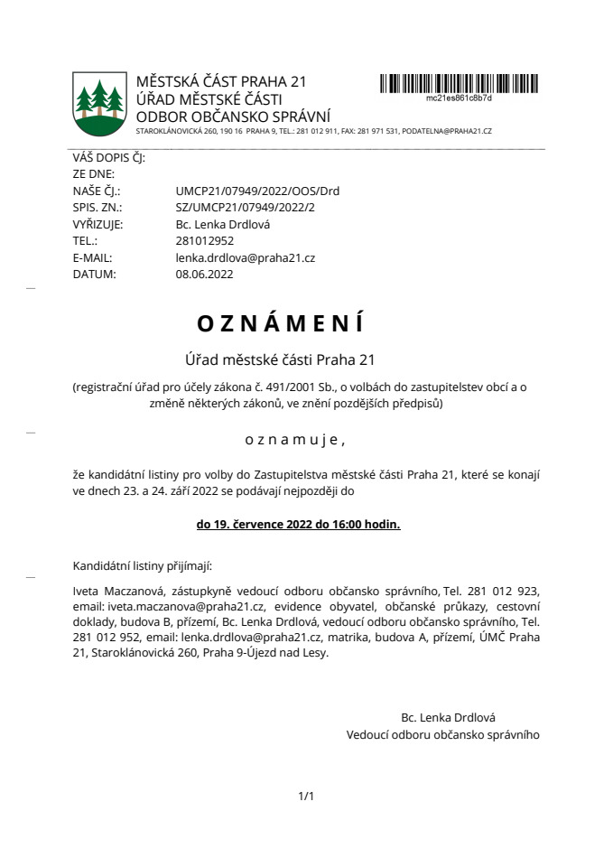 Registrace kandidátních listin pro volby do Zastupitelstva městské části Praha 21