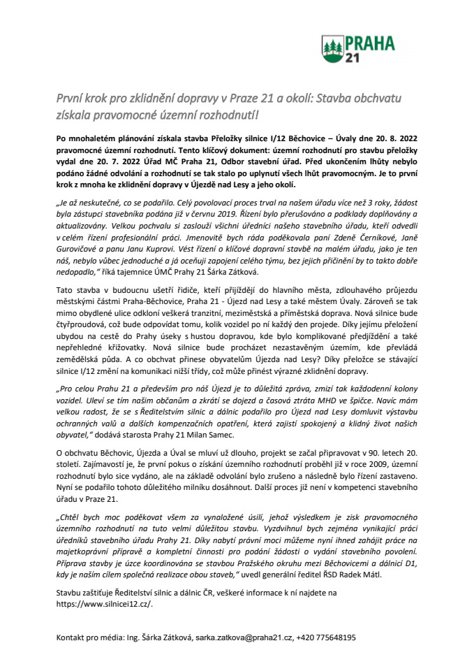 Po mnohaletém plánování získala stavba Přeložky silnice I/12 Běchovice – Úvaly dne 20. 8. 2022 pravomocné územní rozhodnutí. Tento klíčový dokument: územní rozhodnutí pro stavbu přeložky vydal dne 20. 7. 2022 Úřad MČ Praha 21, Odbor stavební úřad. Před ukončením lhůty nebylo podáno žádné odvolání a rozhodnutí se tak stalo po uplynutí všech lhůt pravomocným. Je to první krok z mnoha ke zklidnění dopravy v Újezdě nad Lesy a jeho okolí.