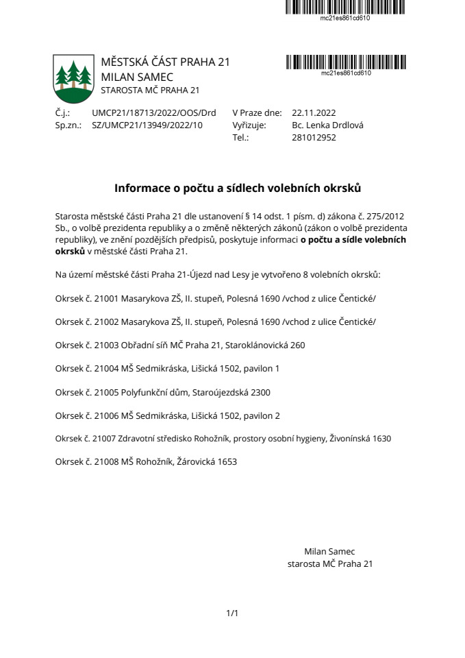 Starosta městské části Praha 21 dle ustanovení § 14 odst. 1 písm. d) zákona č. 275/2012 Sb., o volbě prezidenta republiky a o změně některých zákonů (zákon o volbě prezidenta republiky), ve znění pozdějších předpisů, poskytuje informaci o počtu a sídle volebních okrsků v městské části Praha 21.