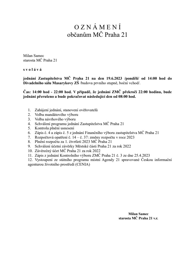 Starosta MČ Praha 21 zve občany na jednání ZMČ, které se bude konat v pondělí, 19.6.2023 od 14 hodin v Divadelním sále MZŠ.
