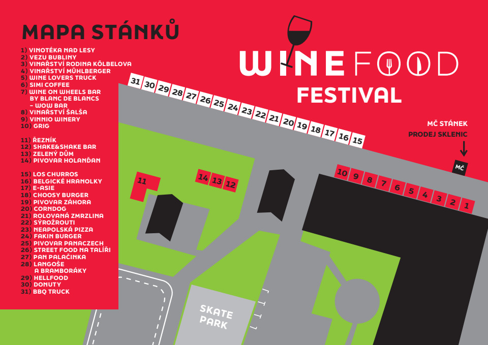 Vinaři z Moravy, Itálie, Německa a dalších regionů. Pivo od 3 vyhlášených pivovarů. Sladké pochoutky pro milovníky dezertů. Lahodné pokrmy z grilu, street food speciality a mnoho dalšího. Oblíbené limonády a osvěžující nápoje.
