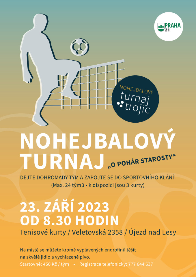 Srdečně Vás zveme na tradiční nohejbalový turnaj "O pohár starosty", který se koná dne 23. září 2023 od 8:30 na tenisových kurtech ve Veletovské ulici 2358.