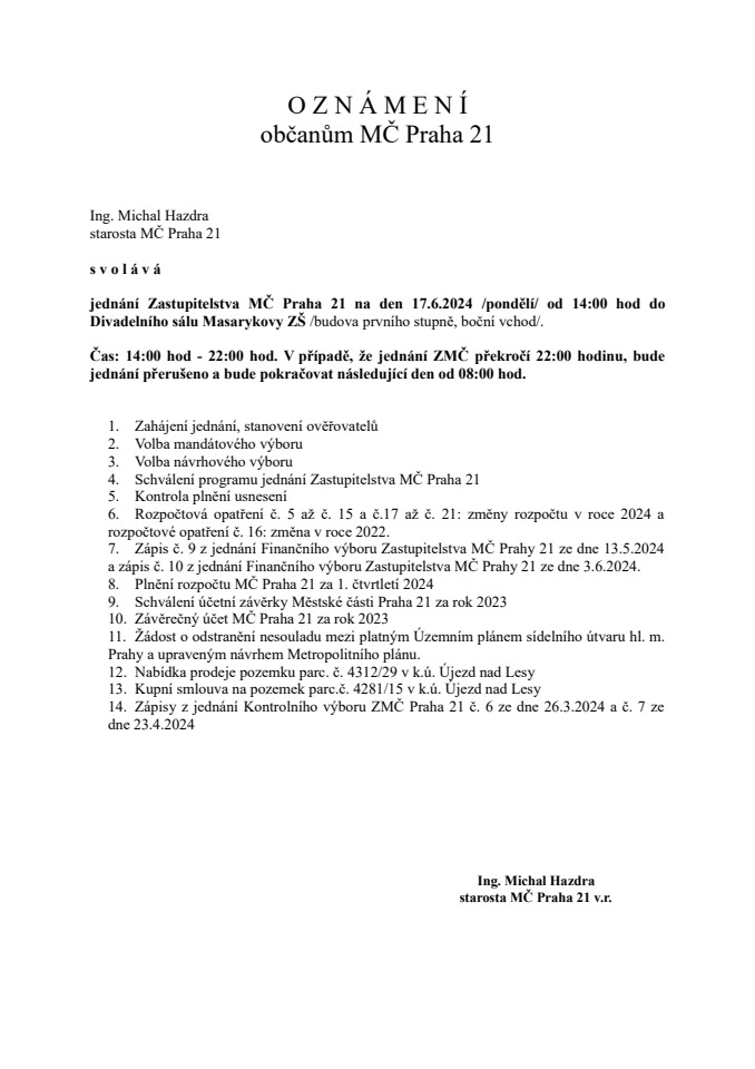 jednání Zastupitelstva MČ Praha 21 na den 17. 6. 2024 /pondělí/ od 14:00 hod do Divadelního sálu Masarykovy ZŠ /budova prvního stupně, boční vchod/.