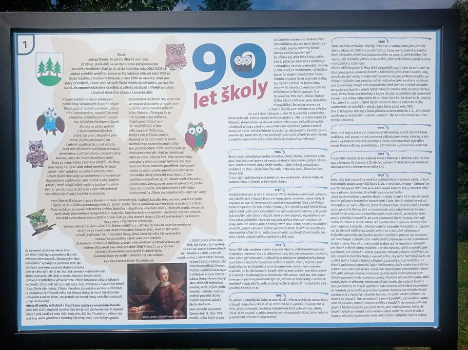 k 90. výročí Masarykovy ZŠ jsme pro vás připravily výstavu mapující školní docházku újezdských dětí od Marie Terezie po současnost. Panely 1-12 jsou umístěny na stojanech před školou, panely 13-17 na plotě u rododendronu v parku. Výstavu věnujeme všem učitelům, žákům, rodičům a v dřívějších dobách obecním zastupitelstvům nebo v současné době zřizovateli městské části, kteří 90 let tvořili a tvoří „čtyřlístek” dějin újezdské školy, jehož cílem by měla být spolupráce vedoucí ku prospěchu všech výše jmenovaných. Za finanční podporu a možnost vytvořit velkoplošnou venkovní výstavu děkujeme zřizovateli naší školy Městské části Praha 21. Budeme rády, když výstava, na které jsme pracovaly tři čtvrtě roku, osloví všechny újezdské generace.