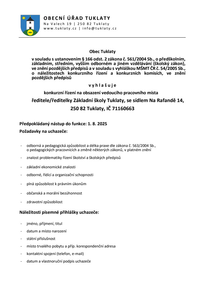 • Obec Tuklaty vy h l a š u j e konkurzní řízení na obsazení vedoucího pracovního místa