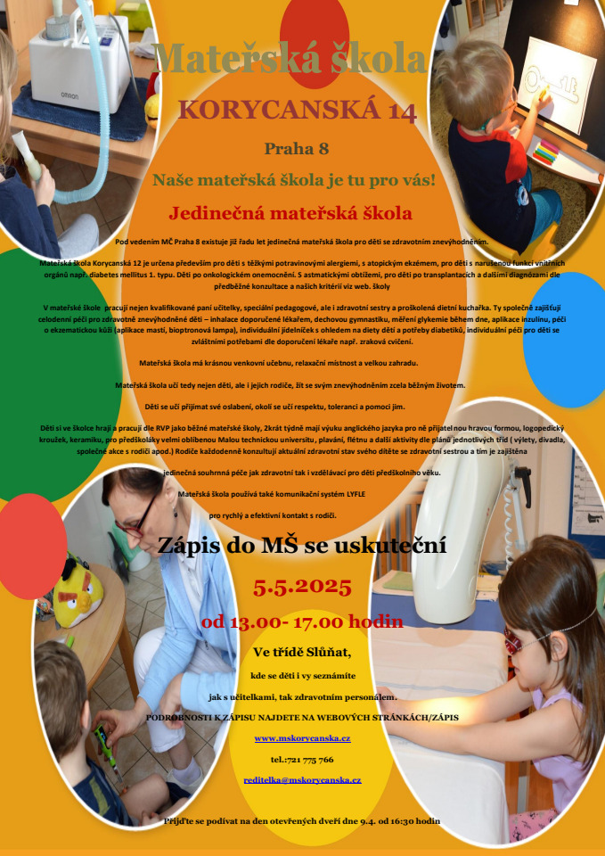 Mateřská škola Korycanská 12 je určena především dětem s těžkými potravinovými alergiemi, s atopickým ekzémem, pro děti s narušenou funkcí vnitřních orgánů (diabetes mellitus 1. typu), pro děti s astmatickými obtížemi, pro děti po transplantacích, s cystickou fibrózou, imunodeficity s chronickým onemocnění střev, srdečními onemocněními, po onkologických onem., zkrátka pro děti, které běžné mateřské školy nemohou přijmout.
