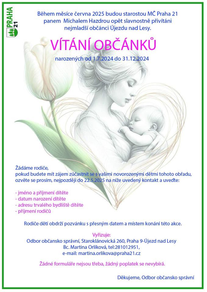 Během měsíce června 2025 budou starostou MČ Praha 21 panem Michalem Hazdrou opět slavnostně přivítáni nejmladší občánci Újezdu nad Lesy.