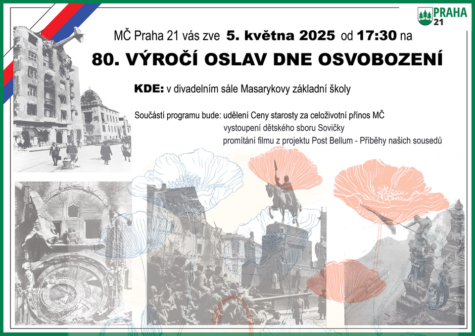 Srdečně vás zveme na oslavu 80. výročí osvobození, která se uskuteční 5. května 2025 od 17:30 v divadelním sále Masarykovy základní školy.