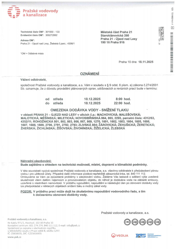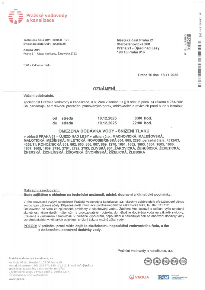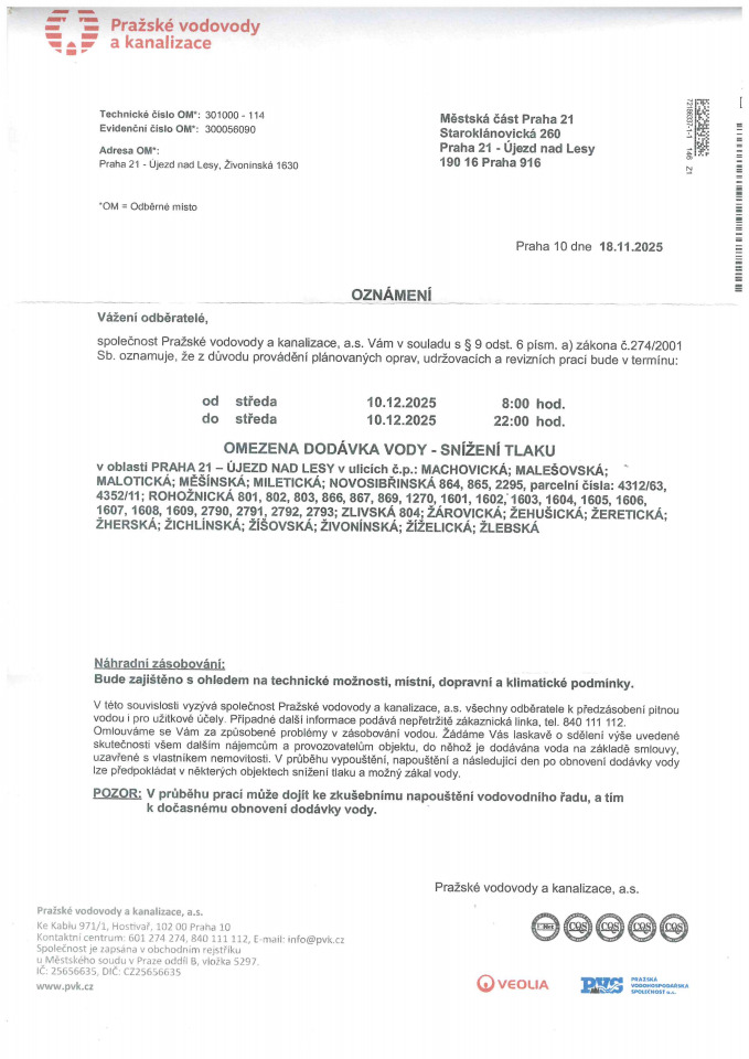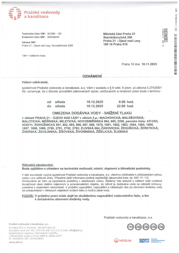 OZNÁMENÍ - omezena dodávka vody