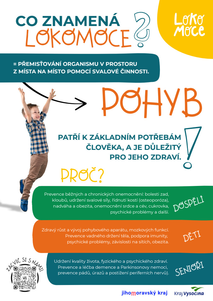 Lokomoce má zásadní význam pro celé tělo i duši. Pomáhá předcházet bolestem zad, nadváze a srdečním onemocněním, ale také posiluje psychickou odolnost a zlepšuje náladu. U dětí podporuje přirozený vývoj, koordinaci i zdravé držení těla, u dospělých pomáhá kompenzovat sedavý způsob života, a seniorům zase přispívá k udržení soběstačnosti, rovnováhy a radosti ze života.