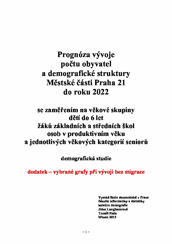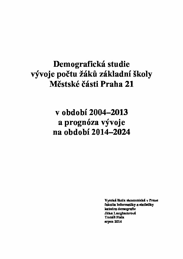 Vysoká škola ekonomická v Praze, katedra demografie, zpracovala demografické studie do roku 2024 s důrazem na vývoj dětí v předškolním a školním věku a občanů seniorského věku.