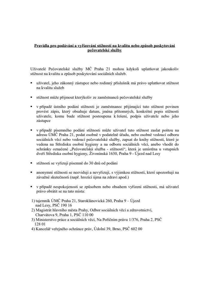 Městská část Praha 21- Pečovatelská služba, Staroklánovická 260, 190 16 Praha 9 - Újezd nad Lesy