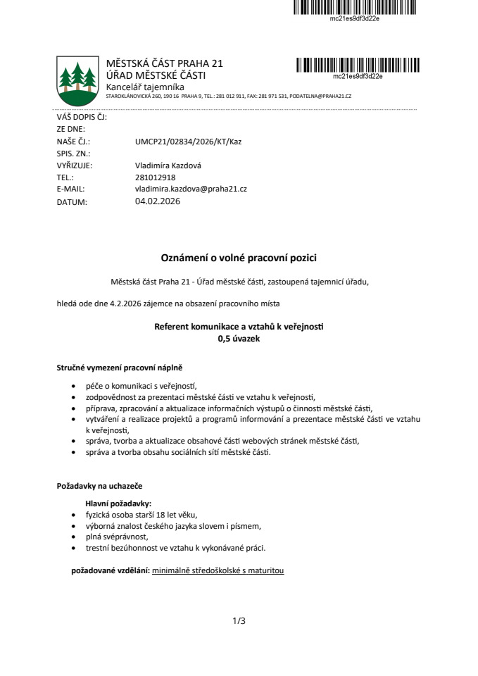 ÚMČ Praha 21 vyhlašuje výběrové řízení na obsazení pracovního místa Referent komunikace a vztahů k veřejnosti 0,5 úvazek – ÚMČ Praha 21.