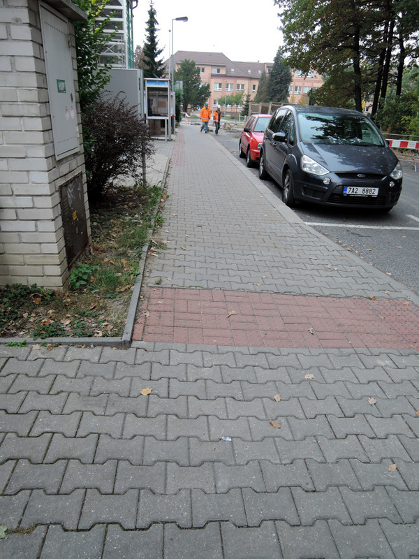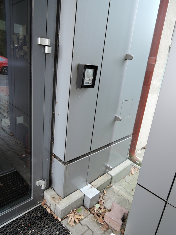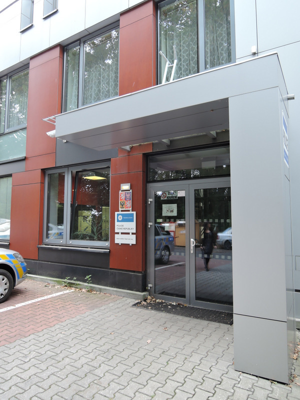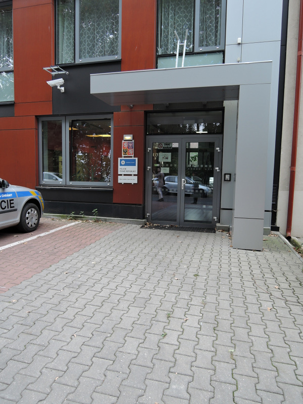 Chodník před objektem má kvalitní povrch ze zámkové dlažby. Vstupní dveře objektu jsou dvoukřídlé (hlavní křídlo šířka 77 cm, vedlejší křídlo šířka 82 cm) a otevírají se mechanicky směrem ven. Zvonková signalizace (výška 120 cm) je umístěna vpravo u dveří. Ze zádveří (šířka 257 cm, hloubka 335 cm) vedou do prostoru ohlašovny jednokřídlé dveře (šířka 84 cm), které se otevírají mechanicky směrem ze zádveří.
