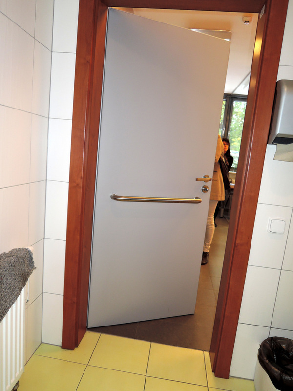 Přístupná toaleta (dveře šířka 80 cm; kabina šířka 180 cm, hloubka 196 cm) je samostatná a vstup má přímo z prostoru ohlašovny. Jednokřídlé dveře do WC nejsou označené a otevírají se mechanicky směrem ven. Přístup k míse z pohledu od vstupu do kabiny je zprava. Prostor pro vozík vedle WC mísy je dostatečný (šířka 124 cm). Toaletní mísa je vybavena jedním sklopným a jedním pevným madlem.