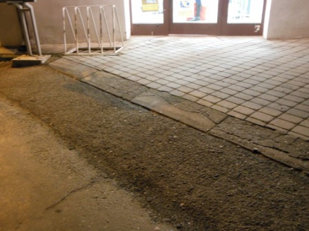Přístupový chodník má kvalitní povrch ze zámkové dlažby. Hlavní vstupní dveře objektu jsou jednokřídlé (šířka 87 cm) s prahem (výška 2 cm) a otevírají se mechanicky směrem dovnitř. Zvonková signalizace u dveří chybí.