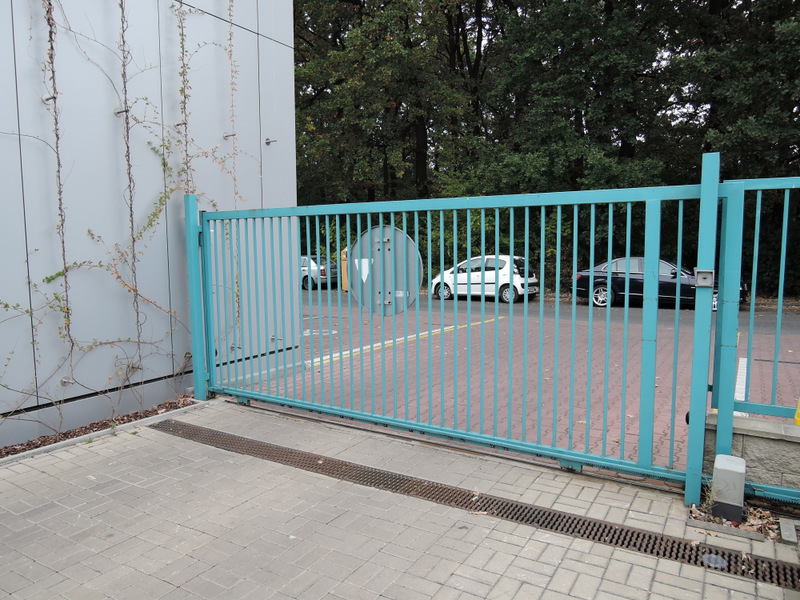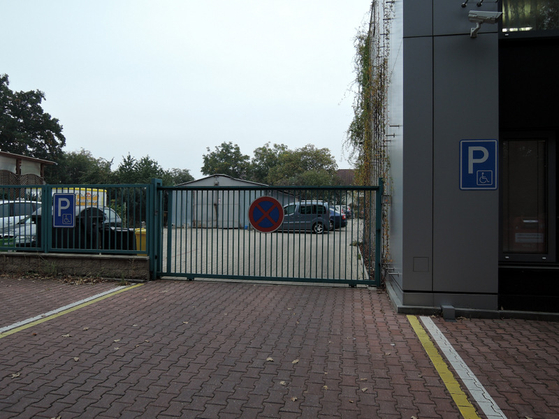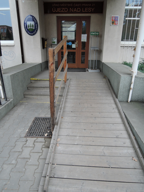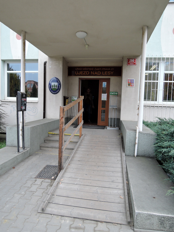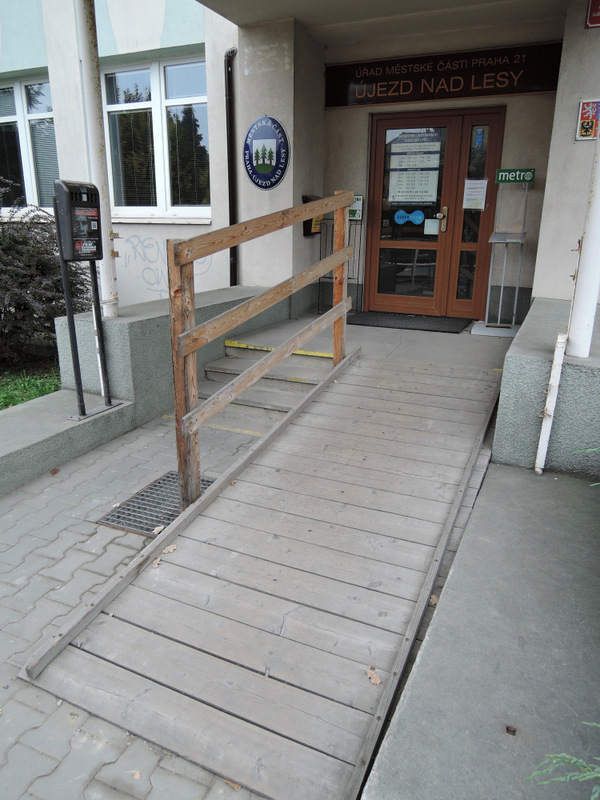 Chodník před objektem má kvalitní povrch ze zámkové dlažby. Pro kompenzaci schodiště (+3 schody) je před hlavním vstupem k dispozici přímá dřevěná rampa (sklon 15 %, šířka 104 cm, délka 300 cm). Rampa je opatřena jednostranným madlem (výška 118 cm). Manipulační prostor nad rampou je dostatečný. Hlavní vstupní dveře jsou dvoukřídlé (hlavní křídlo šířka 79 cm, vedlejší křídlo šířka 40 cm) a otevírají se mechanicky směrem dovnitř. Zvonková signalizace (výška 136 cm) je umístěna vlevo u dveří za kovovým stojanem.K dispozici je rovněž vedlejší vstup z ulice Hulická kovovou bránou s automatickým otvíráním z recepce. Zvonková signalizace (výška 158 cm) je umístěna vpravo u brány. Ze dvora vedou do vstupní haly budovy jednokřídlé dveře (šířka 92 cm), které se otevírají mechanicky směrem ven. Ve dveřích je práh (výška 2 cm). Před dveřmi je nájezd s mírným sklonem (5 – 6 %).