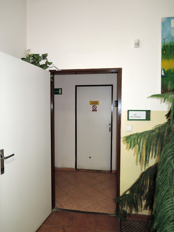Upravená toaleta s nedostatečným rozměrem (dveře šířka 80 cm; kabina šířka 140 cm, hloubka 136 cm) je součástí hygienického zázemí v přízemí budovy. Vstupní dveře na toalety jsou jednokřídlé (šířka 90 cm) a otevírají se mechanicky směrem ven. Následuje stísněná předsíň (šířka 149 cm, hloubka 141 cm). Jednokřídlé dveře do kabiny WC jsou označené a otevírají se mechanicky směrem ven. Přístup k míse z pohledu od vstupu do kabiny je zleva. Prostor pro vozík vedle WC mísy je dostatečný (šířka 93 cm). Toaletní mísa a je vybavena pouze jedním sklopným madlem. Toaleta se uzamyká, klíč je k dispozici na recepci.