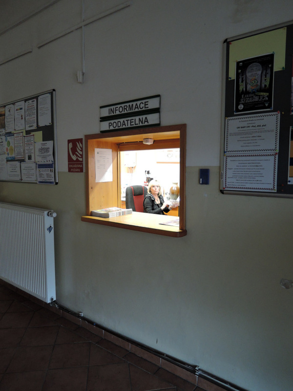 Recepce je umístěna vpravo za hlavním vstupem (pult výška 107 cm). Ve vstupní hale je k dispozici infokiosek s dotykovou obrazovkou (střed obrazovky výška 146 cm). Manipulační prostor v interiéru je dostatečný. V přízemí je umístěna matrika (dveře šířka 86 cm; zvonková signalizace 142 cm) a oddací síň (dveře hlavní křídlo šířka 67 cm, vedlejší křídlo šířka 71 cm). 1. a 2. patro budovy jsou přístupné pouze schodištěm (+14, +10 schodů ; +9, +13 schodů).