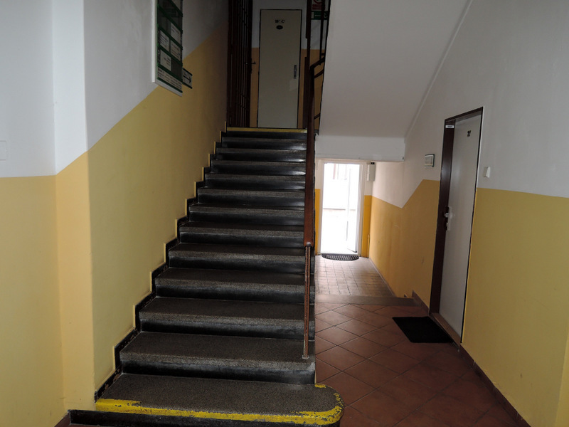 Chodník před objektem má kvalitní povrch ze zámkové dlažby. Vstupní dveře jsou jednokřídlé (šířka 92 cm) a otevírají se mechanicky směrem dovnitř. Ve dveřích je práh (výška 2 cm). Zvonková signalizace u dveří chybí.Vedlejší vstup z vnitřního dvora je bariérový (+2 schody). Vstupní dveře ze dvora jsou jednokřídlé (šířka 73 cm) a otevírají se mechanicky směrem ven.