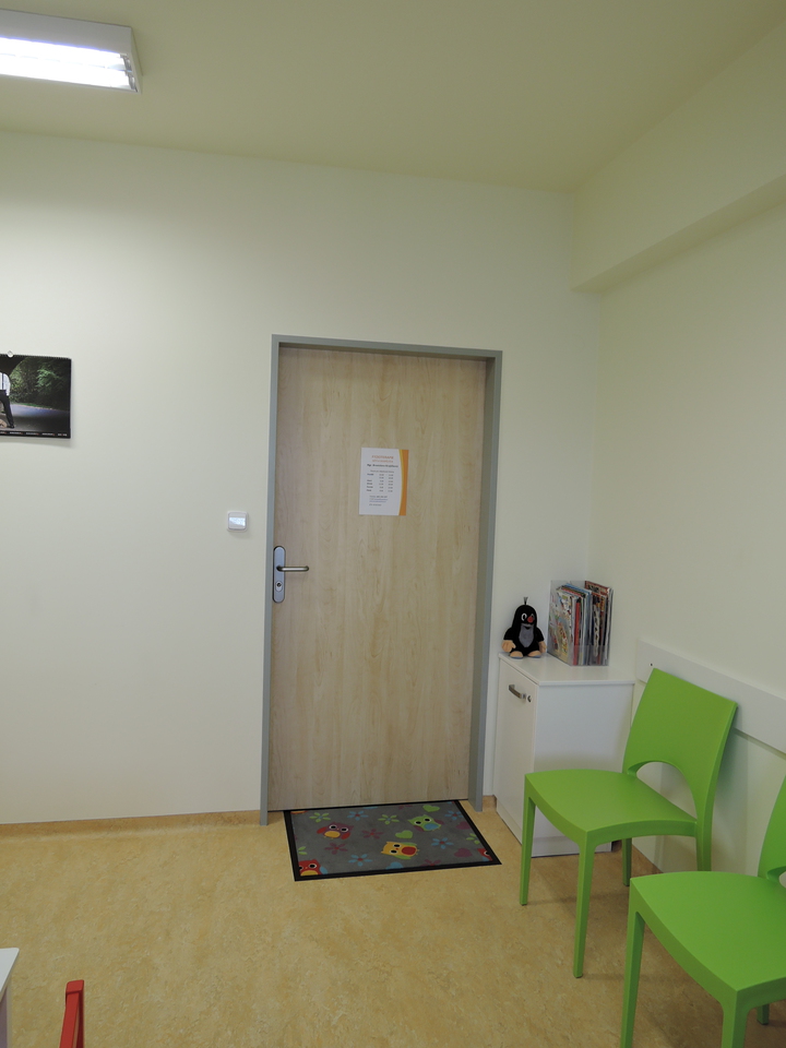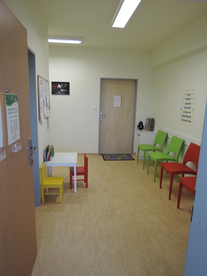 Patra budovy propojuje schodiště a osobní výtah, od kterého vede k ordinaci prostorná chodba. Dveře do čekárny i ordinace jsou jednokřídlé (šířka 90 cm). Manipulační prostor v interiéru je dostatečný.