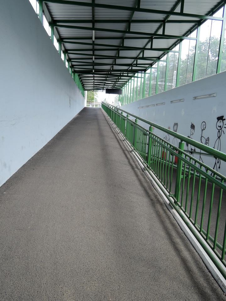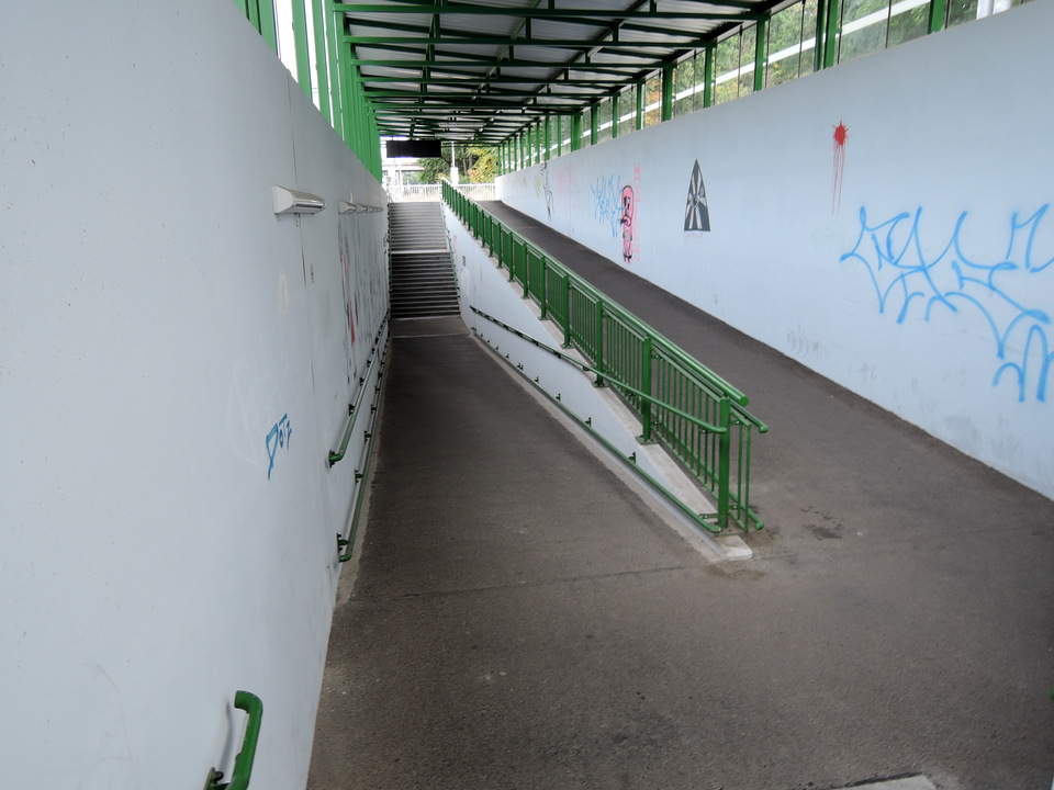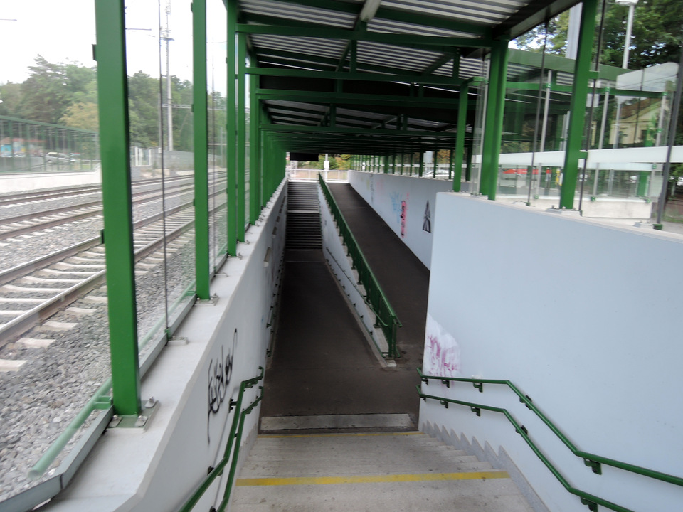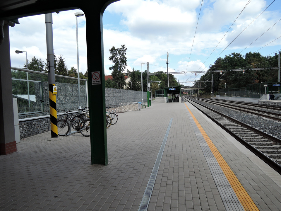 Propojení mezi nástupišti je řešeno podchodem se schodišti a soustavou nevhodných dlouhých ramp (směr do Prahy: dvojramenná zalomená rampa 1. úsek: sklon 10 %, šířka 255 cm, délka 37 m; 2. úsek: sklon 11 %, šířka 230 cm, délka 17,5 m; směr z Prahy: dvojramenná zalomená rampa 1. úsek: sklon 10 %, šířka 255 cm, délka 34 m; 2. úsek: sklon 10 %, šířka 230 cm, délka 18,2 m).
