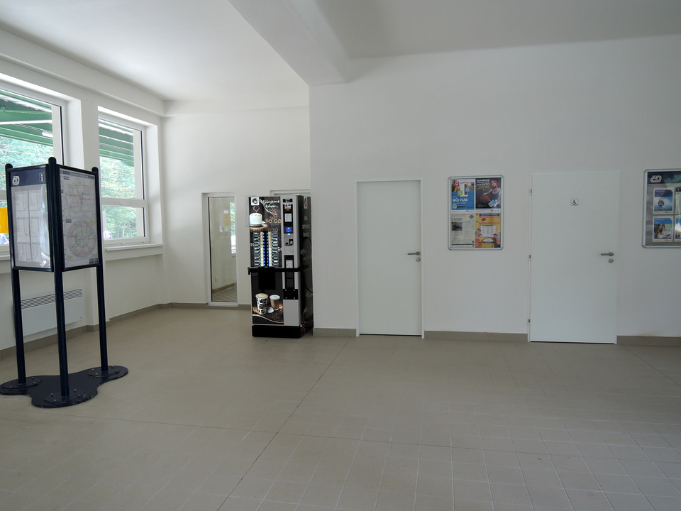 V hale nádražní budovy se nachází pokladna (pult výška 99 cm) a toalety pro veřejnost s upravenou kabinou. Interiér je vybaven lavicemi, manipulační prostor je dostatečný.