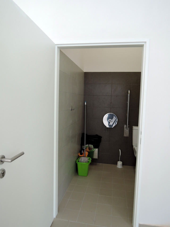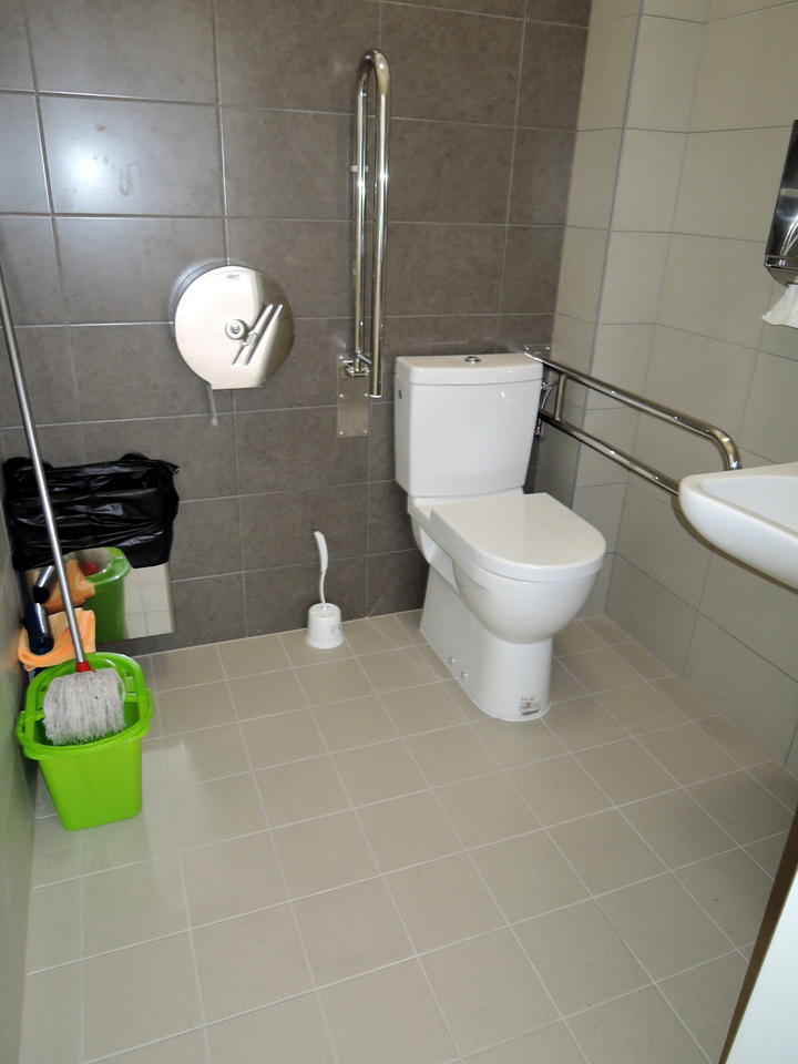 Uzamčená přístupná toaleta (dveře šířka 90 cm; kabina šířka 181 cm, hloubka 167 cm) je samostatná a nachází se v nádražní hale. Klíč je k zapůjčení u pokladny. Jednokřídlé dveře do WC jsou označené a otevírají se mechanicky směrem ven. Přístup k míse z pohledu od vstupu do kabiny je zleva. Prostor pro vozík vedle WC mísy je dostatečný (šířka 109 cm). Toaletní mísa je vybavena jedním sklopným a jedním pevným madlem.
