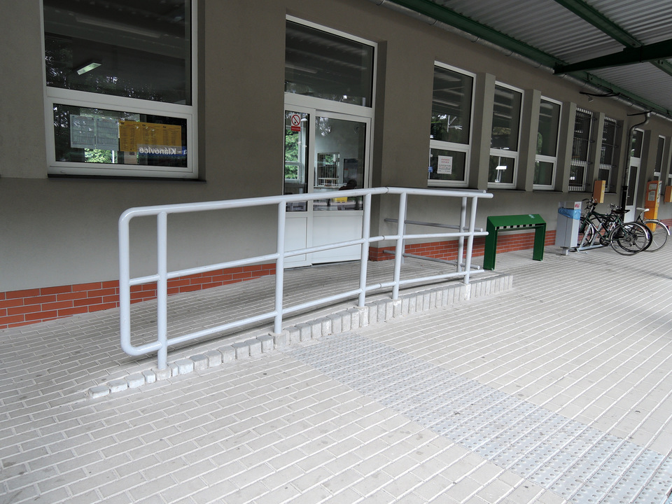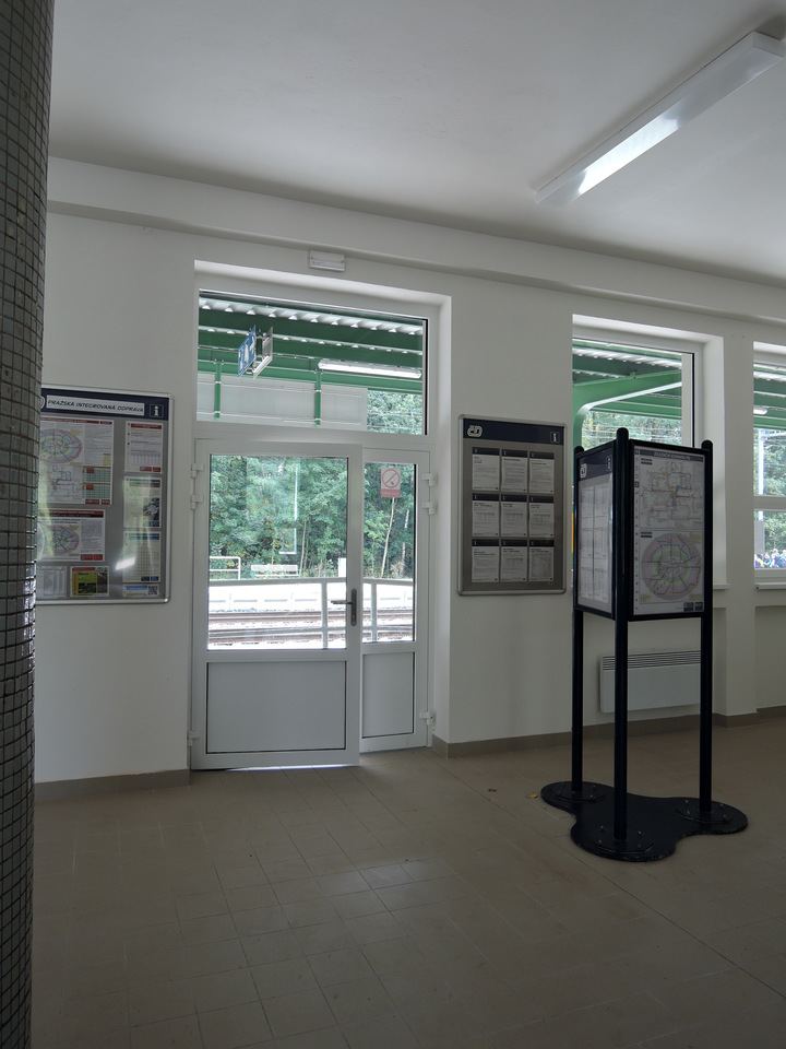Nádražní budova je přístupná z ulice U Trativodu. Zadní vchod se nachází nad krátkým schodištěm (+5 schodů). Dvoukřídlé dveře (hlavní křídlo šířka 97 cm, vedlejší křídlo šířka 61 cm) se otevírají mechanicky směrem dovnitř. Na nástupiště ve směru do Prahy a k přednímu vstupu do nádražní budovy vede po levé straně komunikace ve sklonu (až 7 %). U předního vstupu je přímá jednoramenná rampa (sklon 7 %, šířka 161 cm, délka 263 cm). Rampa má drsný povrch a jednostranné madlo (výška 110 cm). Manipulační prostor nad rampou je dostatečný. Dvoukřídlé dveře (hlavní křídlo šířka 97 cm, vedlejší křídlo šířka 61 cm) se otevírají mechanicky směrem dovnitř. Součástí zastřešeného nástupiště jsou sedačky, automat na jízdenky (nejvyšší tlačítko výška 152 cm, otvor pro vhazování mincí výška 158 cm) a automaty pro označování jízdenek (výška 121 cm).