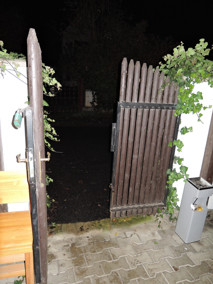 Do předzahrádky s kvalitním dlážděným povrchem vede dvoukřídlá branka (průjezd šířka 119 cm). Před vstupem je +1 schod (výška 3-6 cm, hloubka 5 cm). Jednokřídlé dveře (šířka 90 cm) se otevírají mechanicky směrem ven. Zvonková signalizace není k dispozici. Ze zádveří (šířka 106 cm, hloubka 109 cm) vede do interiéru průchod bez dveří (šířka 80 cm).