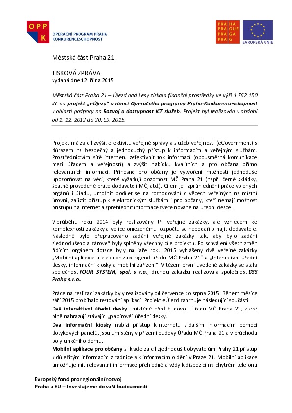Aplikace si klade za cíl zjednodušit obyvatelům Prahy 21 přístup k důležitým informacím z radnice a k informacím o dění v Praze 21. Mobilní aplikace umožňuje mít relevantní informace přehledně a vždy k dispozici na chytrém telefonu (Android, iOS, Windows Phone). Aplikace přináší zefektivnění toku informací (obousměrná komunikace mezi úřadem a veřejností) a umožní jednoduše upozorňovat na věci, které vyžadují pozornost MČ (např. černé skládky, špatně provedené práce dodavateli MČ, atd.)