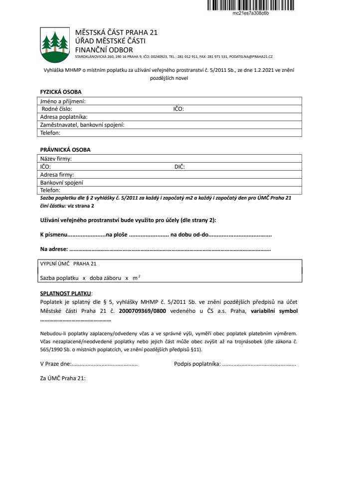 Portál Pražana vám ušetří cestu na úřad. Místní poplatek za užívání veřejného prostranství lze vyřídit elektronicky na Portálu Pražana. Jestliže v Praze 21 Újezd nad Lesy chcete využívat veřejné prostranství způsoby stanovenými zákonem a místní vyhláškou (např. k pořádání akcí, umístění staveb aj.), je třeba váš záměr ohlásit a uhradit místní poplatek.