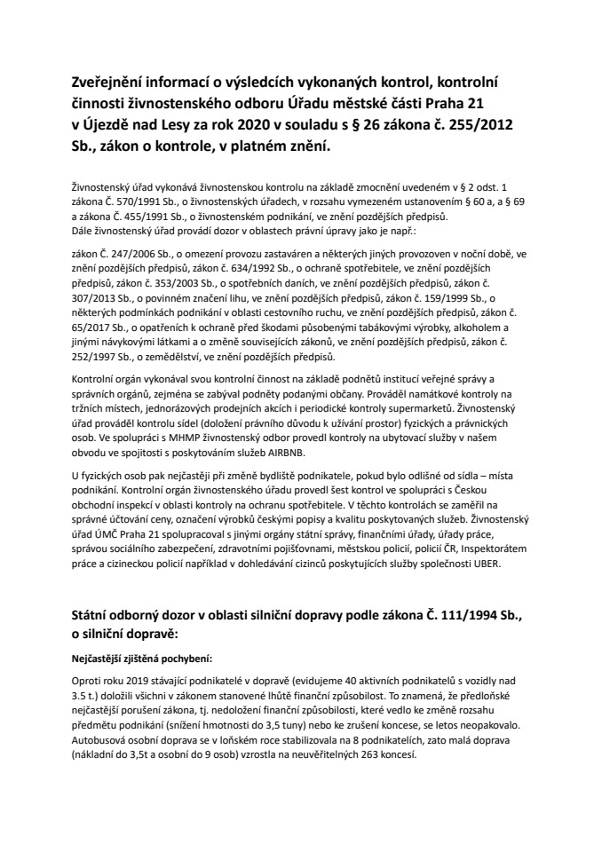 Zveřejnění informací o výsledcích vykonaných kontrol, kontrolní činnosti živnostenského odboru Úřadu městské části Praha 21 v Újezde nad Lesy za rok 2020 v souladu s § 26 zákona č. 255/2012 Sb., zákon o kontrole, v platném znění.