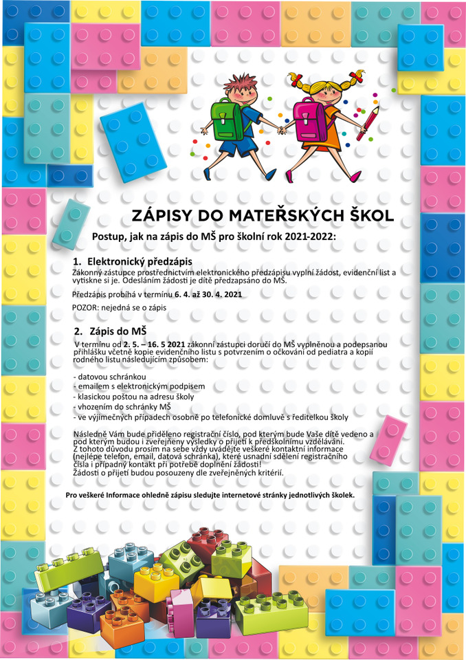 AktualitaZápisy do mateřských škol pro školní rok 2021/22Naposledy upraveno: 17. květen 2021 Osoba odpovědná za aktuálnost informací: StavPublished