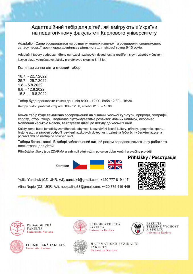 Pedagogická fakulta UK ve spolupráci s dalšími fakultami (FF, FTVS, MFF a PřF UK) pořádá v červenci a srpnu letní kempy pro děti-cizince ve věku 6-15 let. Celá aktivita je zcela zdarma, se zajištěním programu, pitného režimu a svačin.