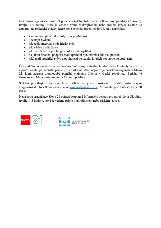 Účastníkům budou zároveň předány ověřené zdroje aktuálních informací a kontakty na služby a profesionální poradenství přímo pro ně zdarma. Akci organizuje nezisková organizace Slovo 21, která zdarma dlouhodobě pomáhá cizincům žijícím v České republice. Setkání je financováno Ministerstvem vnitra České republiky.