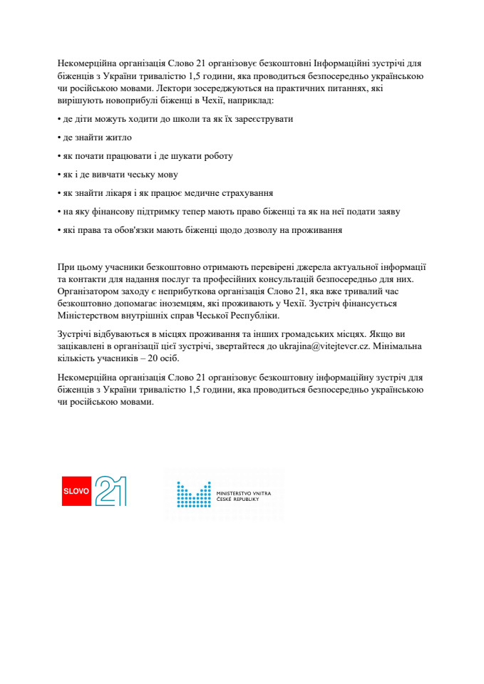 Nezisková organizace Slovo 21 pořádá dne 13.9. od 17.30 do 19.00 hodin v budově úřadu městské části Praha 21, ve velké zasedací místnosti, bezplatné Informační setkání pro uprchlíky z Ukrajiny trvající 1,5 hodiny. Lektoři se zaměřují na praktické otázky, které nově příchozí uprchlíci do ČR řeší, například:
