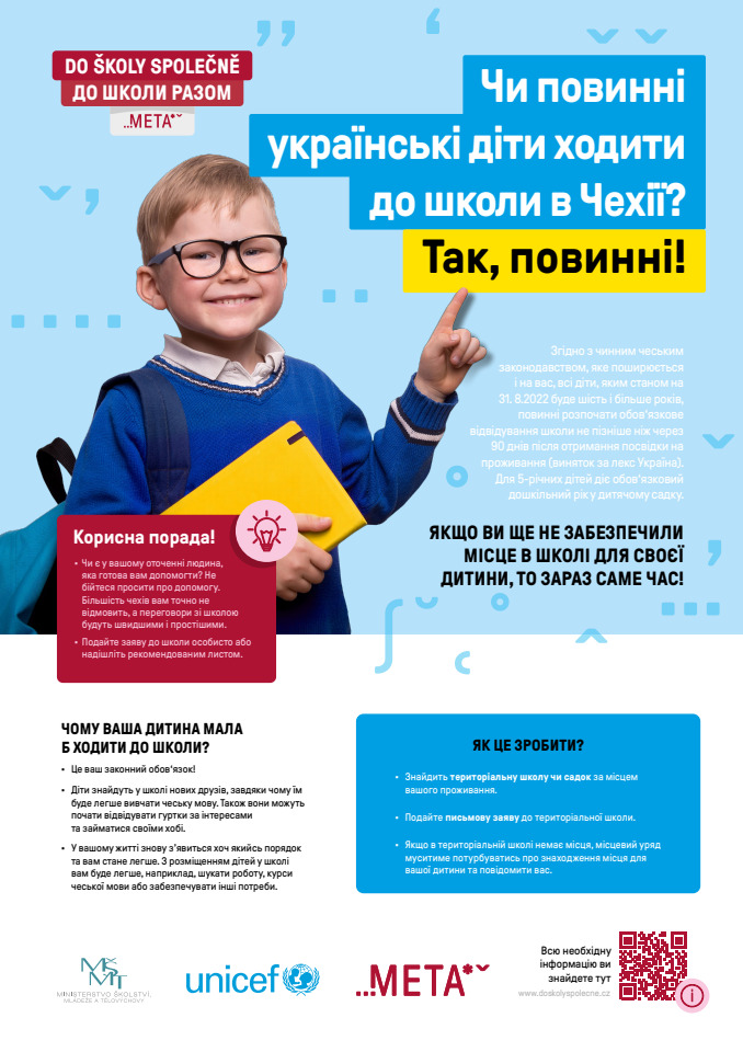 MŠMT spustilo linku na pomoc ukrajinským rodinám. Telefonní číslo (+420) 234 812 345 bude sloužit na dotazy veřejnosti, které souvisejí se vzděláváním ukrajinských dětí na českých školách. V provozu bude každý všední den od 8 do 16 hodin**. Na dotazy budou odpovídat proškolené operátorky, které hovoří jak českým, tak i ukrajinským jazykem**. Spolu s linkou funguje také e-mailová adresa: Tato e-mailová adresa je chráněna před spamboty. Pro její zobrazení musíte mít povolen Javascript..