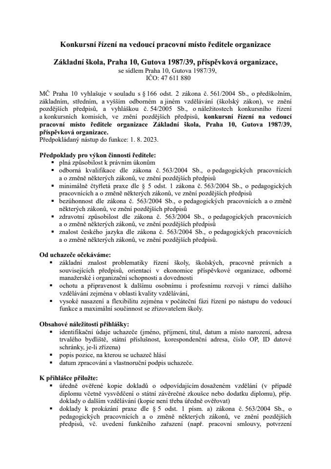 Konkursní řízení na vedoucí pracovní místo ředitele organizace