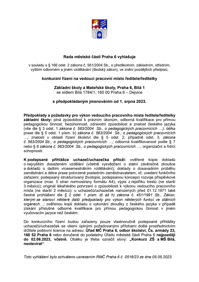 Konkursní řízení na vedoucí pracovní místo ředitele/ředitelky Základní školy a Mateřské školy, Praha 6