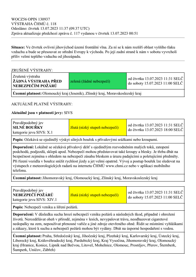 Nařízení č. 6/2019 kterým se stanoví podmínky k zabezpečení požární ochrany v době zvýšeného nebezpečí vzniku požáru, bylo dne 7. 7. 2023 aktivováno výstrahou č. 101/2023 (nízký stupeň nebezpečí) a dne 13.7. 2023 výstrahou č. 118/2023 se od soboty 15.7.2023 od 11:00 hodin zvyšuje na vysoký stupeň nebezpečí s platností do odvolání.