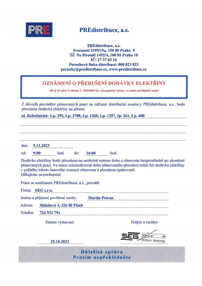 Přerušení dodávky elektřiny - ul. Rohožnická 9.11.2023